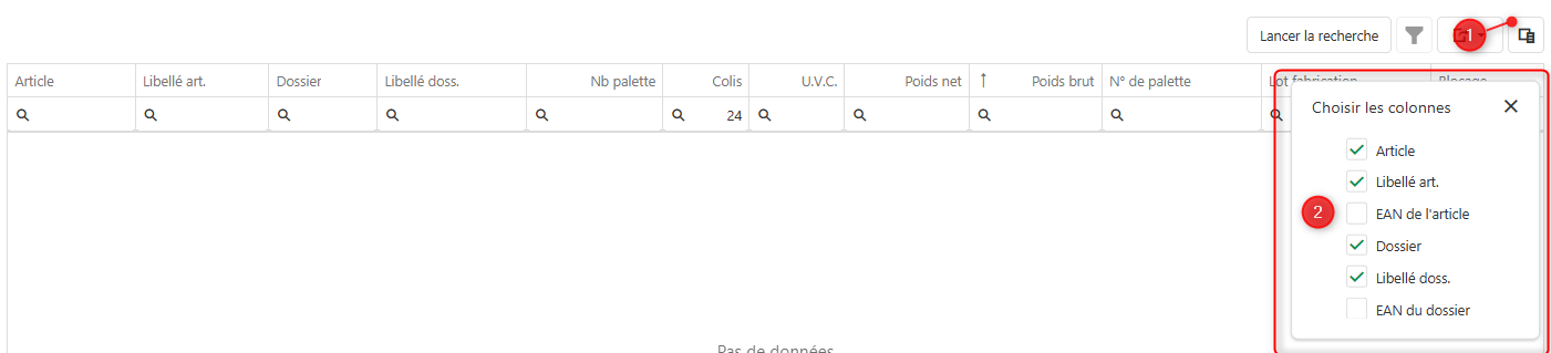 - Liste des colonnes disponible (cocher les cases ajouter des colonnes a la grille)