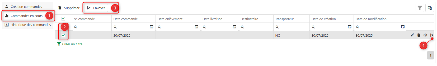 - Après avoir enregistré votre commande, dirigez-vous vers « Commandes en cours » pour envoyer votre commande.