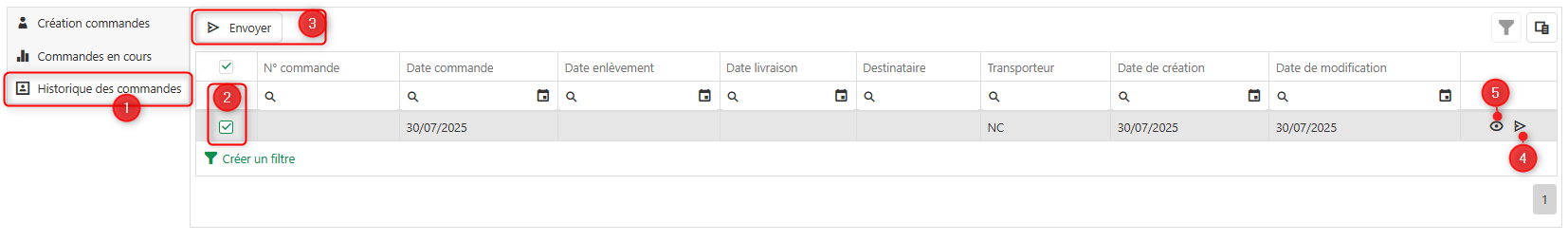 - Cliquez sur l’onglet « Historique des commandes » pour visualiser la liste des commandes déjà envoyées.